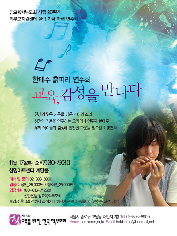 ±×ÀÇ ³ë·¡¿£ ¸Þ½ÃÁö°¡ ´ã°åÁö¸¸ Áú°¨Àº ¾î»öÇÏ´Ù. <Çϴÿ¬¸ø>ÀÇ ¿µÇâÀÌ ±×¸¸Å Å« Å¿Àϱî. ±×·³¿¡µµ »ê°ñû³âÀÇ ¼ø¼öÇÔ, ¼Ò³âƼ¸¦ ¹þÁö ¸øÇÑ ¹Ì¼º(Ú¸á¢)ÀÌ Æí¾ÈÇÏ°Ô ´Ù°¡¿Â´Ù. ±×°¡ ¿ÀÄ«¸®³ª¿Í ¹êµåÀ½¾ÇÀ» °¡Áö°í »ó°æÇÑ´Ù. ¼ö´É(10ÀÏ)ÀÇ »ç½½¿¡¼ ¹þ¾î³ Çлý-Çкθ𸦠À§ÇØ 17ÀÏ ¿ÀÈÄ 7½Ã 30ºÐ »ó¸í´ë¾ÆÆ®¼¾ÅÍ °è´çȦ¿¡¼ °ø¿¬ÇÑ´Ù. À̹ø °ø¿¬Àº '°¡Ä«'ÀÇ ´«¿£ Á»¡ ´ÜüÀÎ Âü±³À°Çкθðȸ°¡ Çкθð±³À°¼¾ÅÍ ¼³¸³±â±ÝÀ» ¸¶·ÃÇÏ·Á´Â 'ºÒ¼øÇÑ Àǵµ'·Î ÁøÇàµÈ´Ù.
