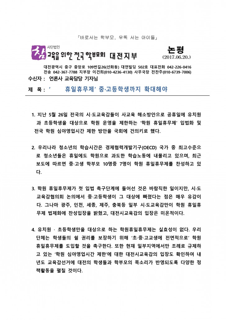 알림 | [대전지부 논평]‘학원 휴일휴무제’ 중·고등학생까지 확대해야 페이지 정보 대전지부 작성일17-06-20 12:43 조회1,661회 댓글0건 이전글 다음글 목록 본문 ‘학원 휴일휴무제’ 중·고등학생까지 확대해야 댓글목록 등록된 댓글이 없습니다. 이전글 다음글 목록