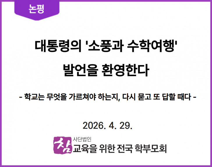 이에 참교육을 위한 전국 학부모회는 대통령의 발언을 환영하는 데 그치지 않고, 학교 현장에서 소풍과 수학여행이 다시 살아나기 위한 구체적 방안을 함께 제안한다.